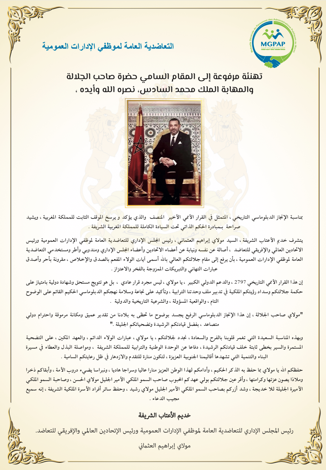 ومما جاء في برقية جلالة الملك “وأغتنم هذه المناسبة، لأعرب لكم عن ارتياحي لما يربط بين شعبينا من وشائج الأخوة المتينة والتقدير المتبادل، مؤكدا لكم حرصي على مواصلة العمل سويا معكم من أجل المضي قدما في تعزيز علاقات التعاون المثمر والتضامن الفاعل القائمة بين بلدينا، بما يستجيب لطموحاتنا وتطلعات شعبينا”.